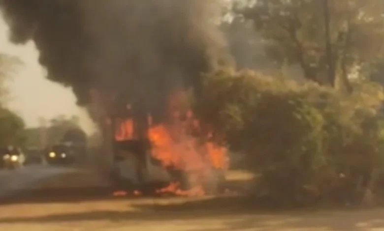 बलौदाबाजार जिले के खरोरा इलाके में यात्रियों से भरी चलती बस में लगी आग ,बस पूरी तरह जलकर खाक …