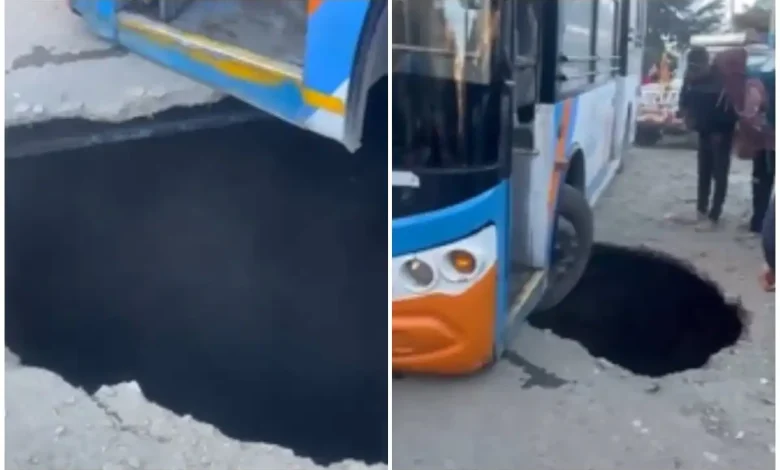 सड़क पर बन गई सुरंग, लड़की गिरी, समाते हुए बची पूरी बस…