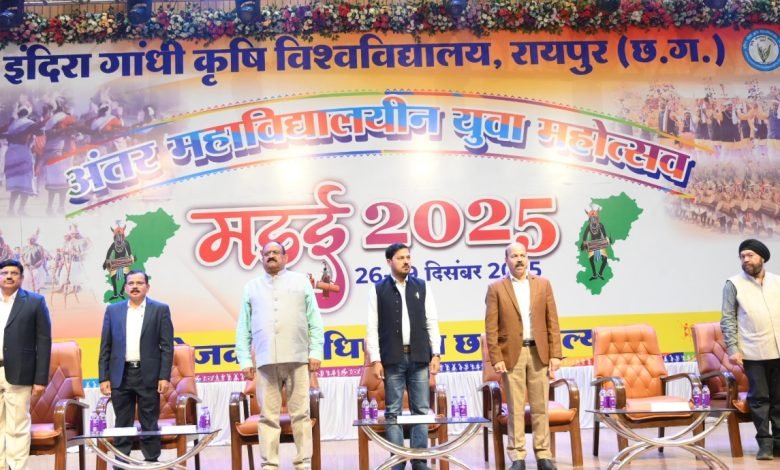 शुभारंभ शोभा यात्रा में विद्यार्थियों द्वारा छत्तीसगढ़ की समृद्ध संस्कृति प्रस्तुत चार दिनों तक बिखरी रहेगी कला – संस्कृति के विविध रंगों की छटा रायपुर -इंदिरा गांधी कृषि विश्वविद्यालय रायपुर में 26 से 29 दिसम्बर 2025 तक आयोजित चार दिवसीय 31वें अंतर महाविद्यालयीन युवा महोत्सव ‘‘मड़ई-2025’ का शुभारंभ 31 महाविद्यालयों के लगभग 900 विद्यार्थियों द्वारा सहभागिता से हुआ। कृषक सभागार…