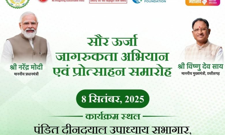 राज्य सब्सिडी वितरण* पीएम कुसुम के आदेश वितरण *शून्य बिजली बिल वालों का सम्मान *जिलों के लिये सूर्य रथ रवानगी * सीएम होंगे मुख्य अतिथि रायपुर। छत्तीसगढ़ स्टेट पाॅवर डिस्ट्रीब्यूशन कंपनी तथा नेशनल सोलर एनर्जी फेडरेशन ऑफ इंडिया के संयुक्त तत्वावधान में 18 सितंबर 2025 को दीनदयाल उपाध्याय प्रेक्षागृह, साइंस काॅलेज के पास सुबह 11 बजे से “सौर ऊर्जा जागरूकता…