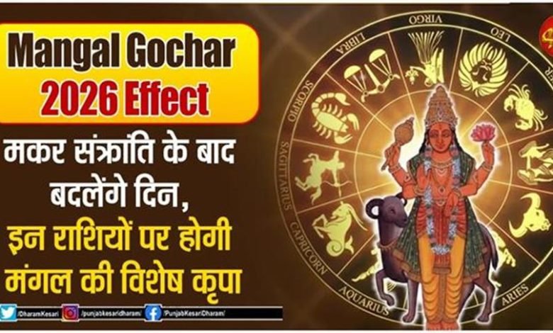 Mangal Gochar 2026: मकर संक्रांति के बाद ग्रहों के सेनापति मंगल (Mars Transit) राशि परिवर्तन करने जा रहे हैं। ज्योतिष शास्त्र के अनुसार मंगल का गोचर सभी 12 राशियों के जीवन पर गहरा प्रभाव डालता है। यह गोचर कुछ राशियों के लिए भाग्योदय का संकेत देगा, वहीं कुछ को सावधानी बरतने की जरूरत होगी। 16 जनवरी 2026, भोर 4 बजकर 27…