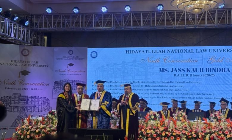 रायपुर- हिदायतुल्लाह राष्ट्रीय विधि विश्वविद्यालय रायपुर के नवें दीक्षांत समारोह का आयोजन गरिमामय वातावरण में संपन्न हुआ, जिसमें भारत के मुख्य न्यायाधीश (Chief Justice of India) न्यायमूर्ति सूर्यकांत मुख्य अतिथि के रूप में उपस्थित रहे। अपने दीक्षांत भाषण में मुख्य न्यायाधीश ने विधि स्नातकों से धैर्य, निरंतर अध्ययन, निष्पक्षता और सहयोग की भावना को अपनाते हुए दीर्घ एवं सार्थक विधिक करियर के निर्माण का आह्वान किया।