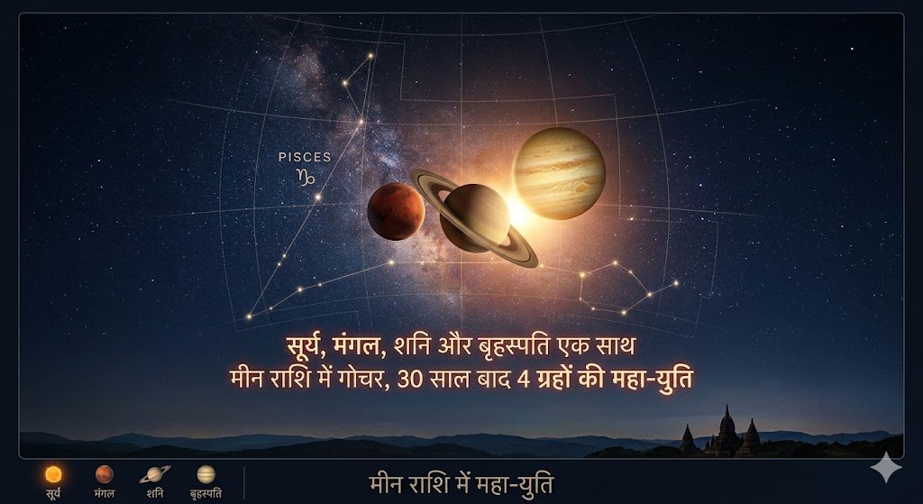 अप्रैल के महीने में करीब 30 साल बाद एक साथ 4 ग्रहों की युति मीन राशि में बनने जा रही है। 2 अप्रैल को मीन राशि में मंगल प्रवेश कर चुके हैं। इसके बाद 3 उग्र ग्रह सूर्य, मंगल और शनि एक साथ मीन राशि में गोचर करेंगे। इनके साथ बुध भी यहां मौजूद रहेंगे। साल 1996 में भी शनि मंगल, सूर्य और बुध की युति मीन राशि में बनी थी।