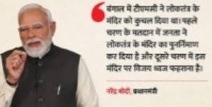 प्रधानमंत्री ने टीएमसी पर तगड़ा हमला करते हुए कहा बंगाल में टीएमसी ने लोकतंत्र के मंदिर को कुचल दिया था। पहले चरण के मतदान में जनता ने लोकतंत्र के मंदिर का पुनर्निमाण कर दिया है और दूसरे चरण में इस मंदिर पर विजय ध्वज फहराना है। पीएम मोदी ने कहा कि टीएमसी का दीया बुझने से पहले फड़फड़ा रहा है। 4 मई को नतीजे आने के बाद टीएमसी के गुंडों को बंगाल में छुपने की जगह नहीं मिलेगी।