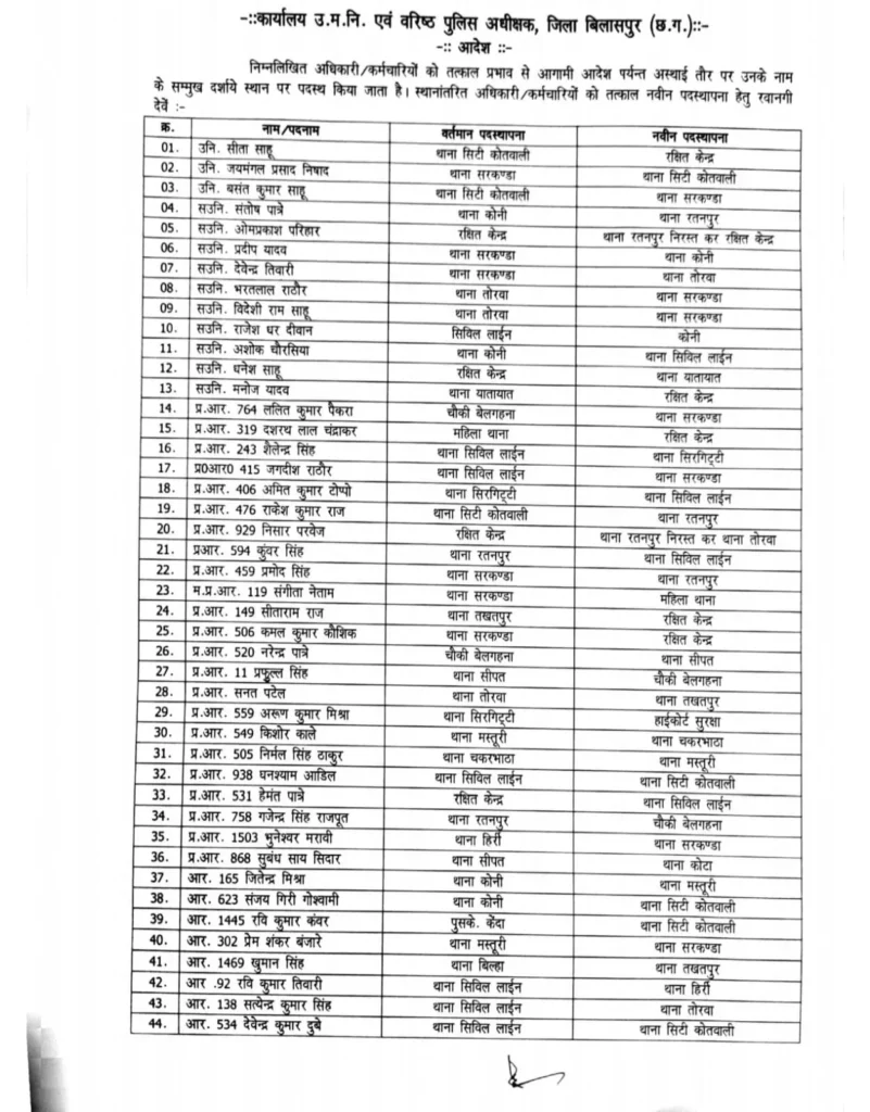 बिलासपुर, छत्तीसगढ़ में इन दिनों तबादलों का दौर लगातार जारी है। विभिन्न विभागों में प्रशासनिक कसावट और कार्यों में तेजी लाने के उद्देश्य से बड़े पैमाने पर स्थानांतरण किए जा रहे हैं। इसी क्रम में बिलासपुर जिले में एक बार फिर पुलिस विभाग में बड़ा फेरबदल किया गया है। पुलिस विभाग में प्रशासनिक कसावट लाने और लंबे समय से एक ही स्थान पर पदस्थ पुलिसकर्मियों को बदलने के उद्देश्य से तबादले किए गए हैं। इस संबंध में एसएसपी रजनेश सिंह ने आदेश जारी किया है।