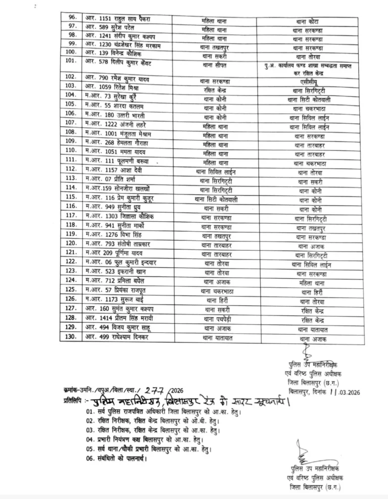 जारी आदेश के अनुसार, जिले में कुल 130 पुलिसकर्मियों का स्थानांतरण किया गया है। इनमें 3 उप निरीक्षक (SI), 10 सहायक उप निरीक्षक (ASI), 23 प्रधान आरक्षक और 94 आरक्षक शामिल हैं। पुलिस प्रशासन का कहना है कि इस फेरबदल का उद्देश्य कार्यप्रणाली को और बेहतर बनाना तथा व्यवस्था में कसावट लाना है।