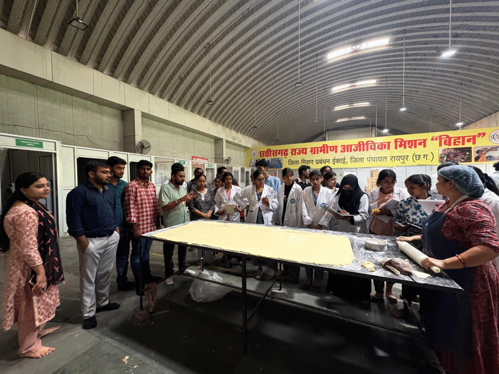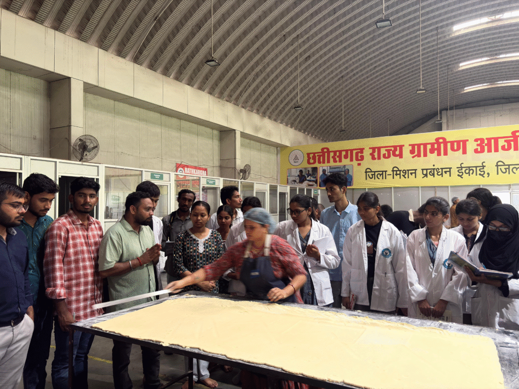 विद्यार्थियों ने भ्रमण के दौरान स्व-सहायता समूह (Self Help Group – SHG) की महिलाओं से बातचीत की और उनकी कार्यशैली को का अध्ययन किया। यह समूह ‘बिहान’ मिशन के अंतर्गत संगठित होकर विभिन्न उद्यमों का संचालन कर रहा है।