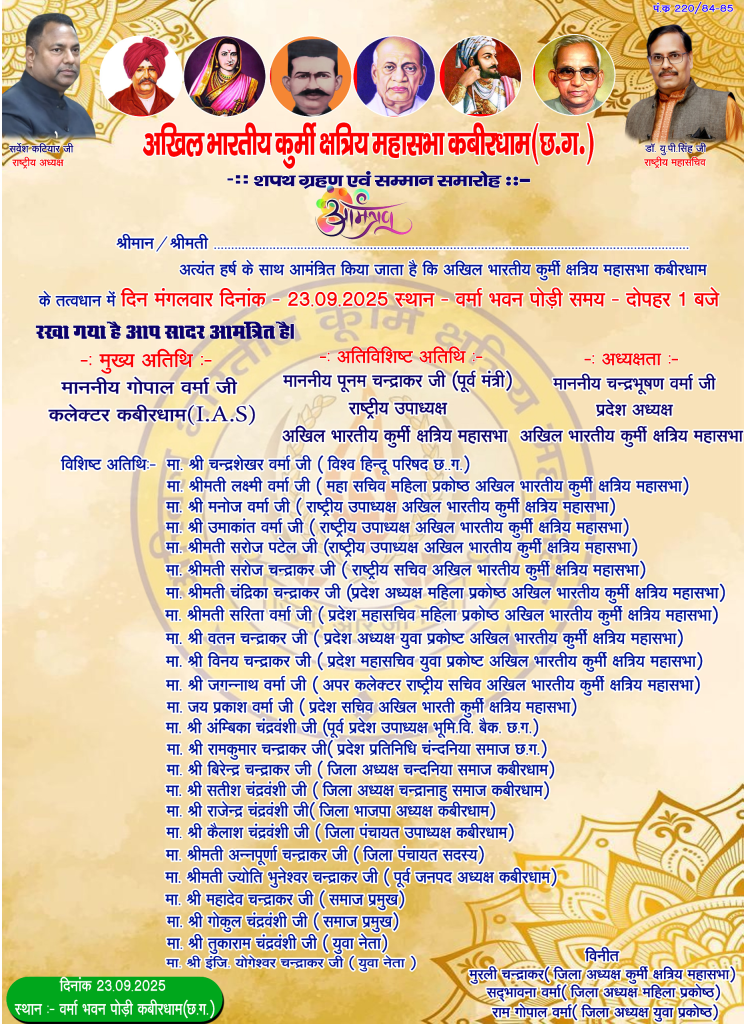 रायपुर। अखिल भारतीय कुर्मी महासभा कबीरधाम के द्वारा शपथ ग्रहण एवं सम्मान समारोह का आयोजन 23 सितंबर को ग्राम पोड़ी में दोपहर 1 बजे से किया गया है। कार्यक्रम के मुख्य अतिथि कलेक्टर कबीरधाम गोपाल वर्मा, राष्ट्रीय उपाध्यक्ष पूनम चंद्राकर कार्यक्रम के अतिविशिष्ट अतिथि होंगे। एवं कार्यक्रम के विशिष्ट अतिथि के रूप में