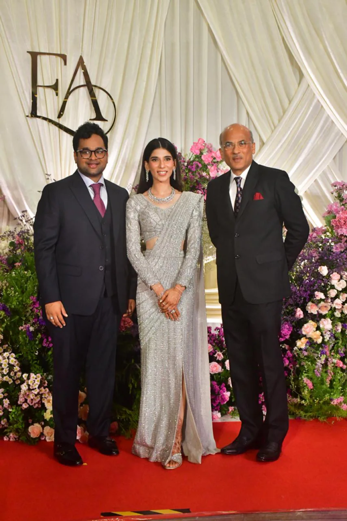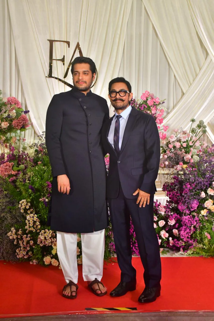 आमिर खान अपने बेटे जुनैद खान के साथ रिसेप्शन में शामिल हुए। बाप-बेटे की इस जोड़ी ने पार्टी में खुशी-खुशी कैमरों के सामने पोज दिया। इस मौके के लिए, आमिर ने एक डार्क सूट के साथ ब्लू शर्ट पहनी थी, जिसके साथ उन्होंने मैचिंग ट्राउजर पहना था। वहीं, जुनैद ने पारंपरिक लुक चुना और गहरे नीले रंग का कुर्ता और सफेद पजामा पहना।