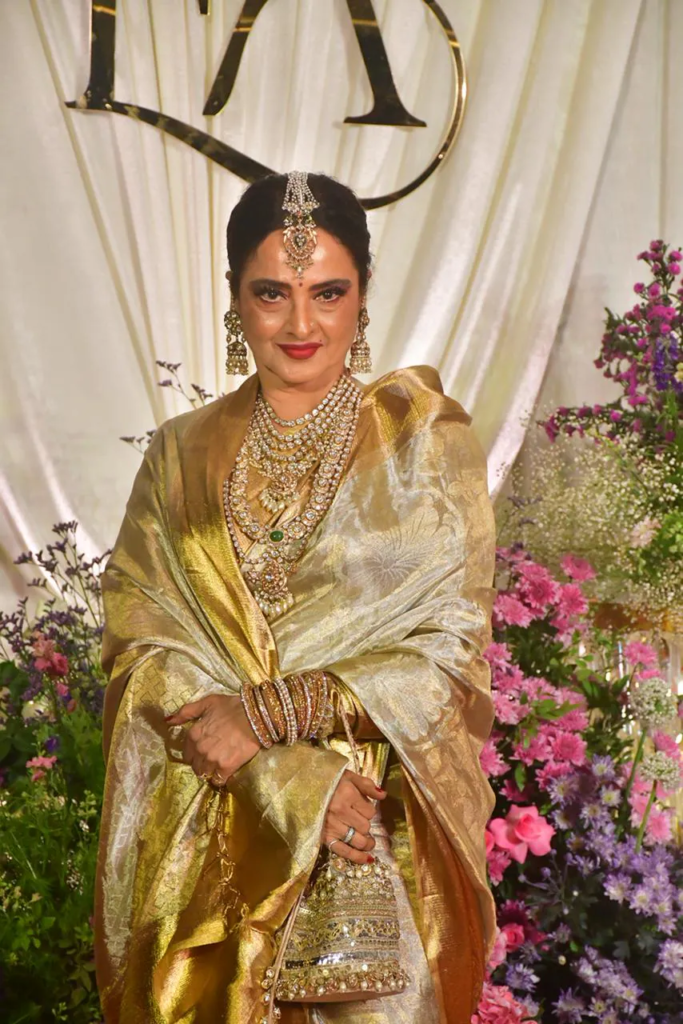 रेखा अपने सिग्नेचर और शानदार अंदाज में इस पार्टी में पहुंची। उन्होंने ग्रीन, सुनहरे और बेज रंग की साड़ी पहनी थी, जिसमें वो हमेशा की तरह ही बेहद खूबसूरत नजर आ रही थीं। रेखा ने वहां मौजूद फोटोग्राफरों को जमकर पोज भी दिए।