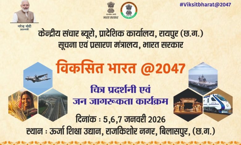 केंद्रीय संचार ब्यूरो, सूचना एवं प्रसारण मंत्रालय, भारत सरकार, रायपुर द्वारा आगामी 5 जनवरी से 7 जनवरी 2026 तक बिलासपुर स्थित ऊर्जा शिक्षा उद्यान में तीन दिवसीय भव्य चित्र प्रदर्शनी एवं जन जागरूकता कार्यक्रम का आयोजन किया जा रहा है। कार्यक्रम का विधिवत शुभारंभ श्री सुशांत शुक्ला, विधायक विधानसभा क्षेत्र बेलतरा के मुख्य आतिथ्य में संपन्न होगा। इस गरिमामय अवसर पर श्रीमती पूजा विधानी, महापौर नगर पालिक निगम बिलासपुर विशिष्ट अतिथि के रूप में उपस्थित रहेंगी। कार्यक्रम की अध्यक्षता श्री भूपेन्द्र सवन्नी, अध्यक्ष, छत्तीसगढ़ राज्य अक्षय ऊर्जा विकास अभिकरण (क्रेडा) द्वारा की जाएगी।